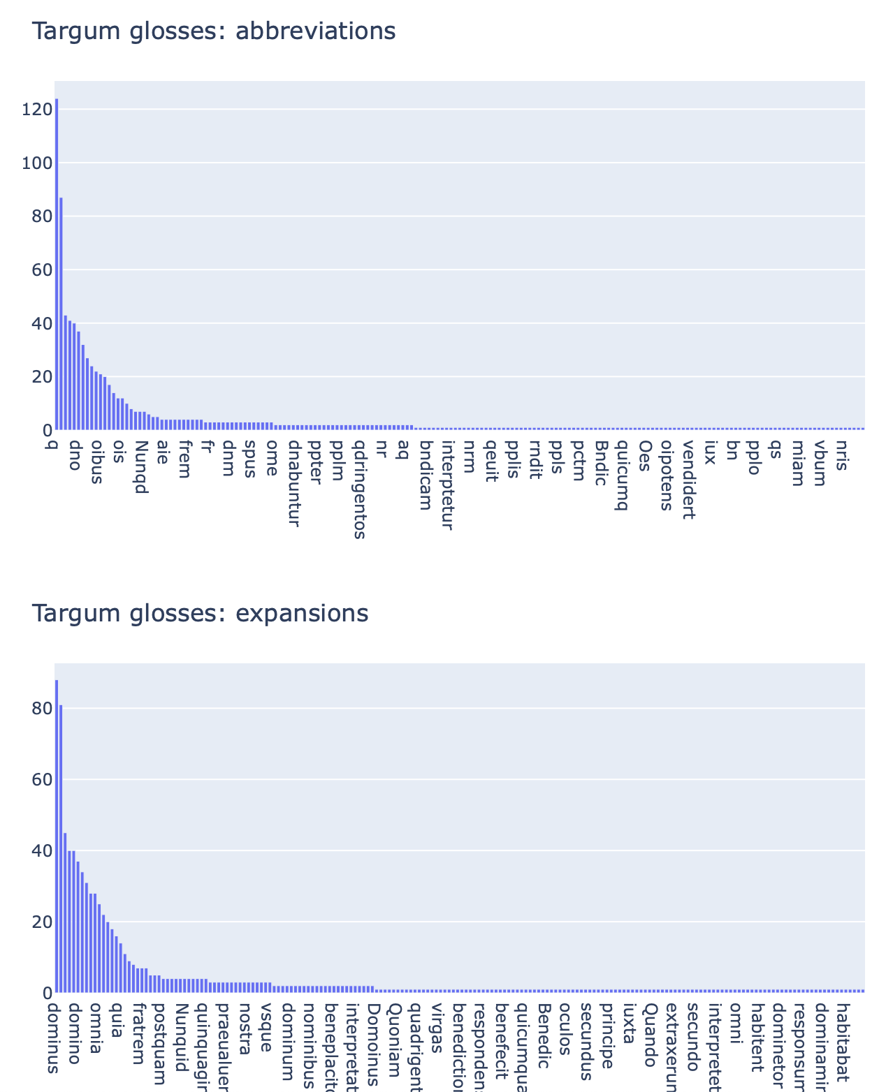 Plots frequencies of abbreviations and expansion in the editions of the Latin glosses to the Targum Onkelos and to the Septuagint.