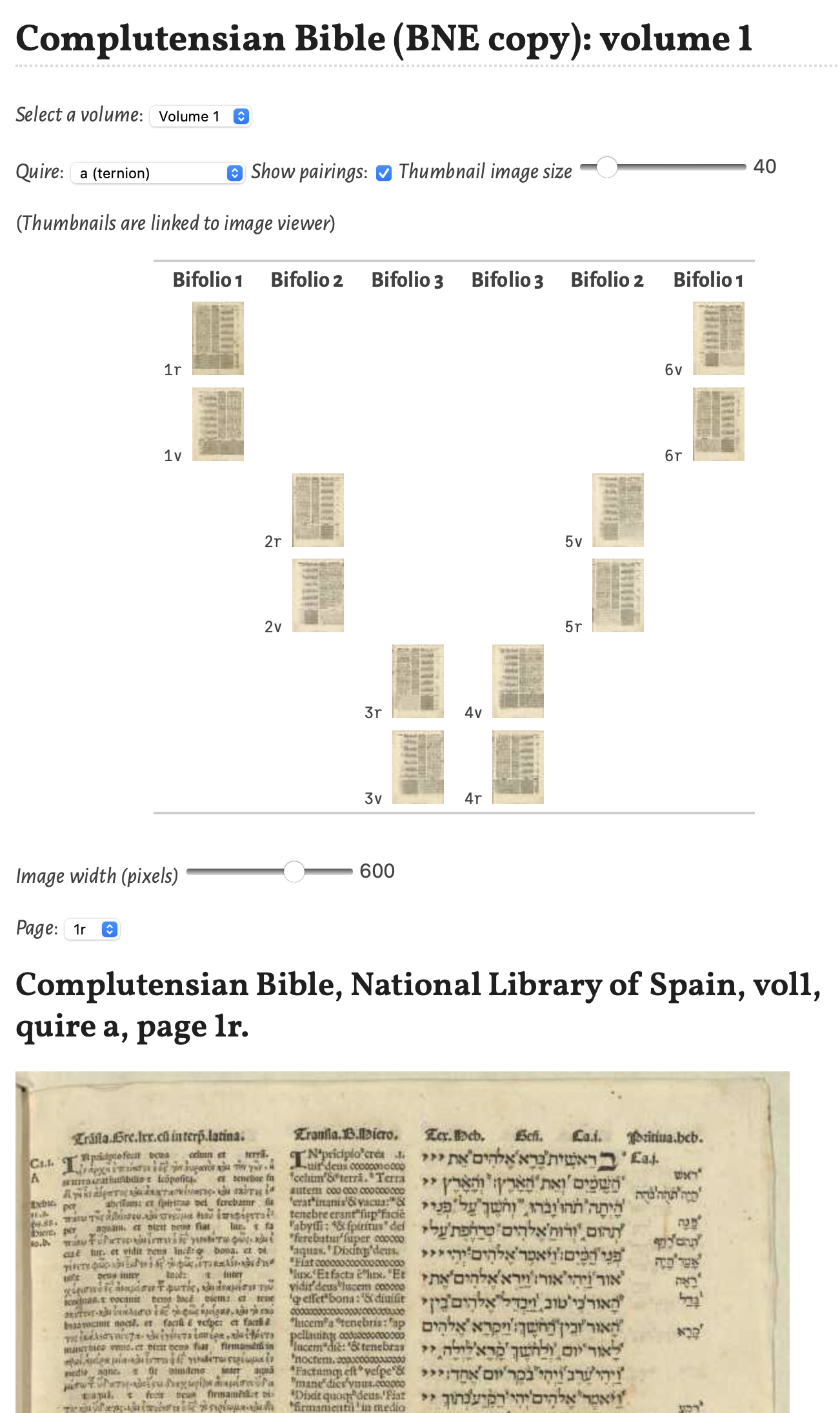 Select a volume, quire and page to see a page image linked to pannable/zoomable view. Optionally see a tabular summary of the quire’s structure with thumbnail images linked to an image viewer.