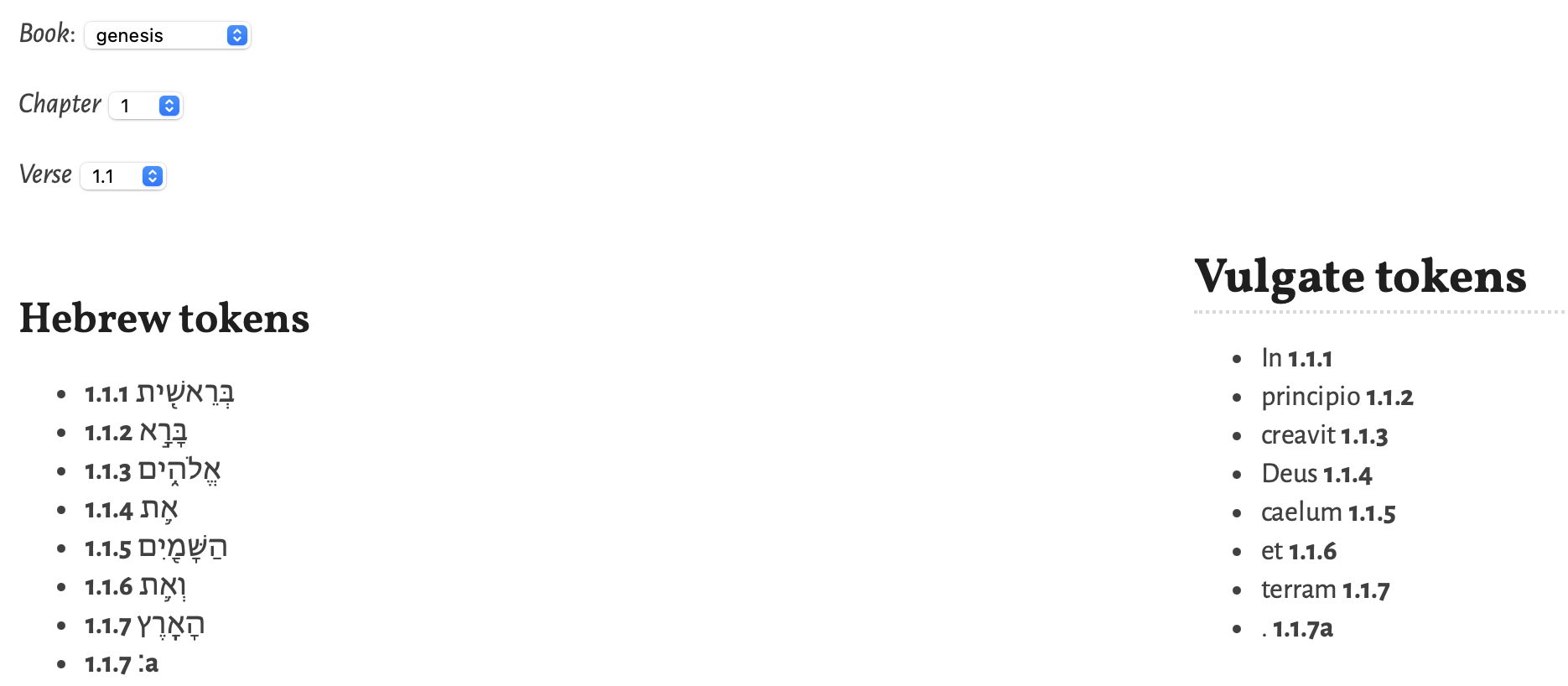 Choose a passage and list orthographic tokens of the Hebrew Bible and Vulgate texts in adjacent columns, with identifying passage element from the token’s URN.
