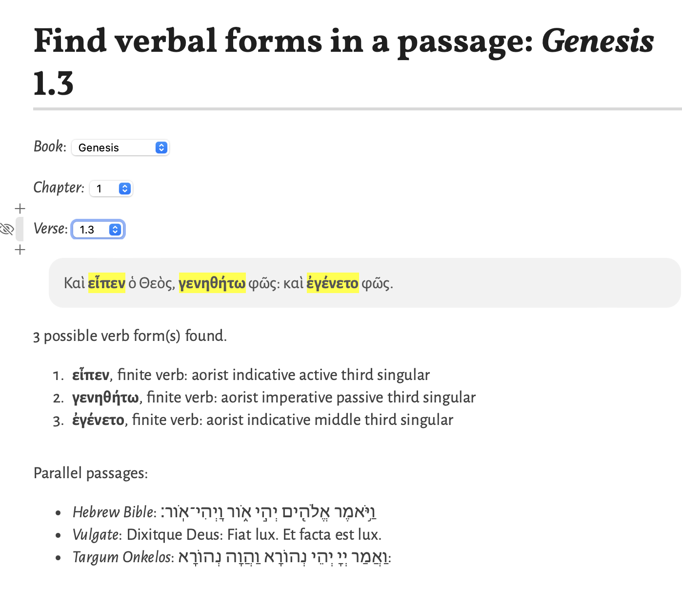 Find possible verb forms in a passage of Greek; highlight the tokens in context and list full identification.