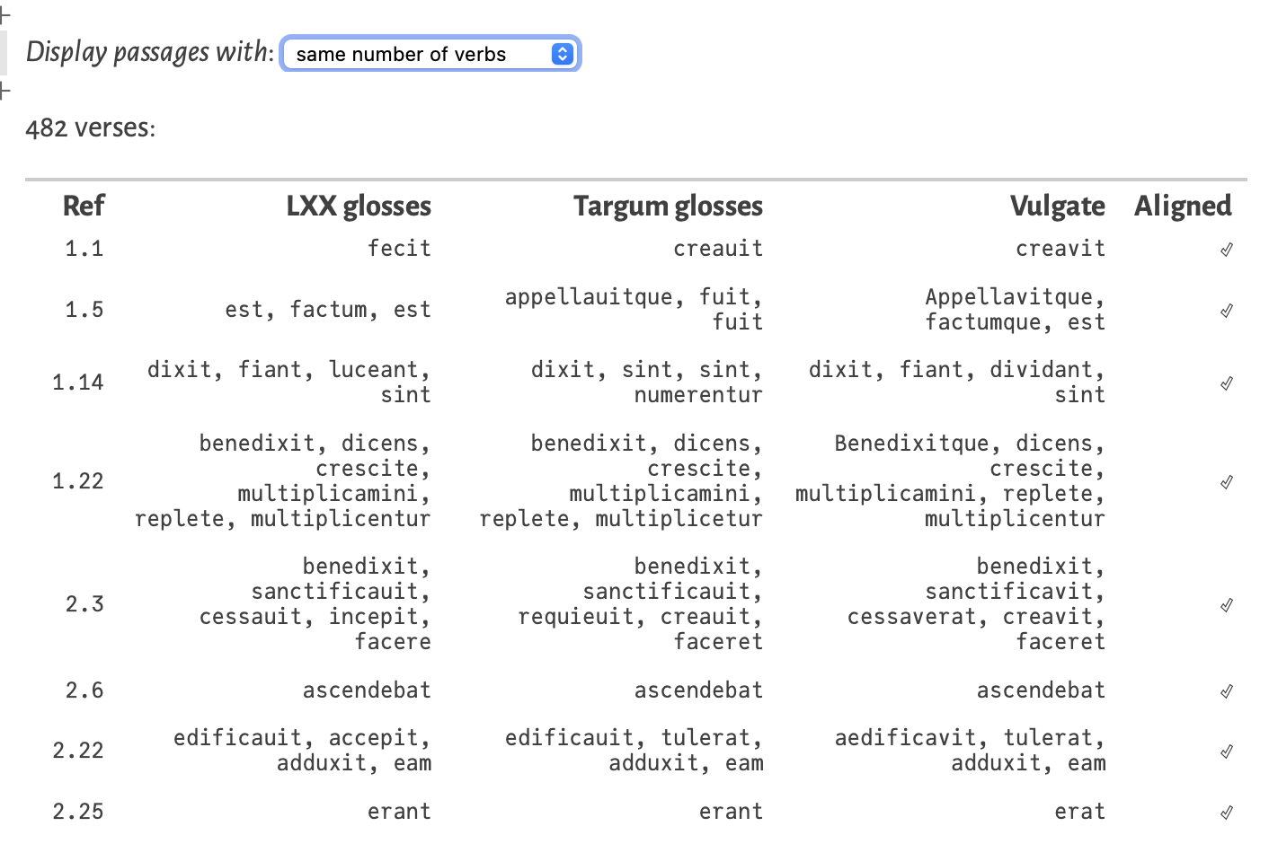 Find all verb verbs in the Vulgate and the Latin glosses to the Targum Onkelos and the Septuagint. Choose to view only passages with the same number of verbs or a different number of verbs, or all passages; then list, in parallel columns, the verb forms showing up in each verse.