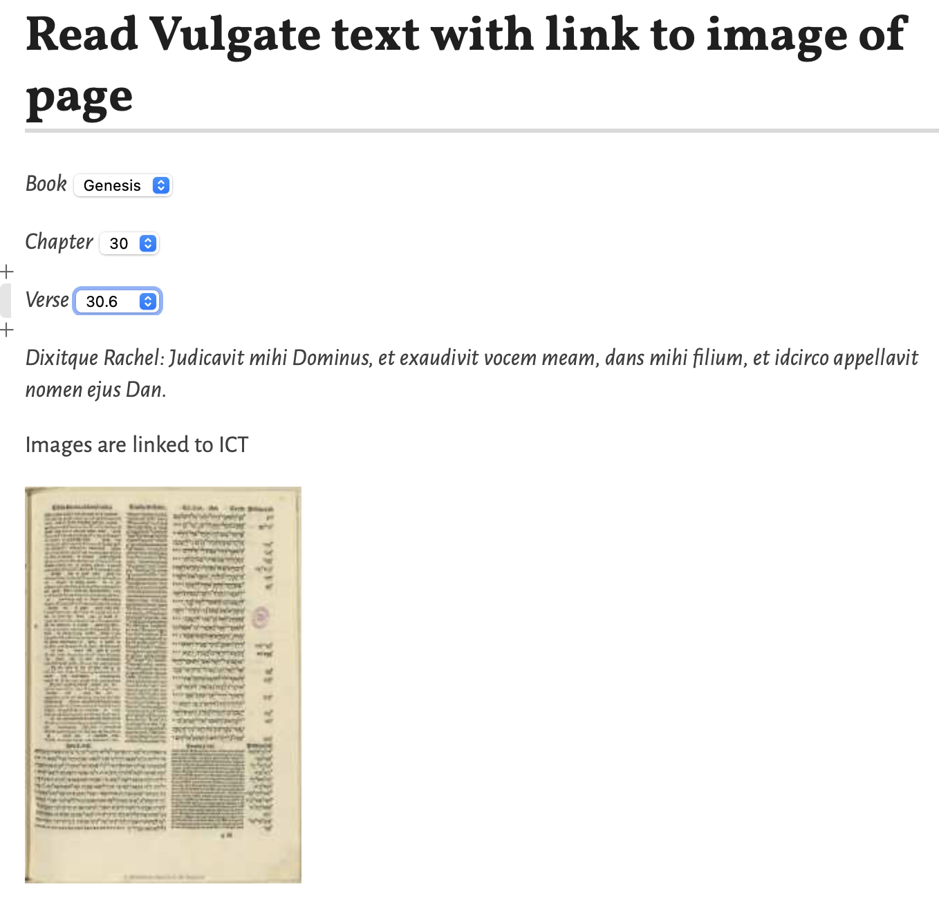 Select a passage, read the Vulgate text of passage along with zoomable/pannable image of the page where that passage occurs.