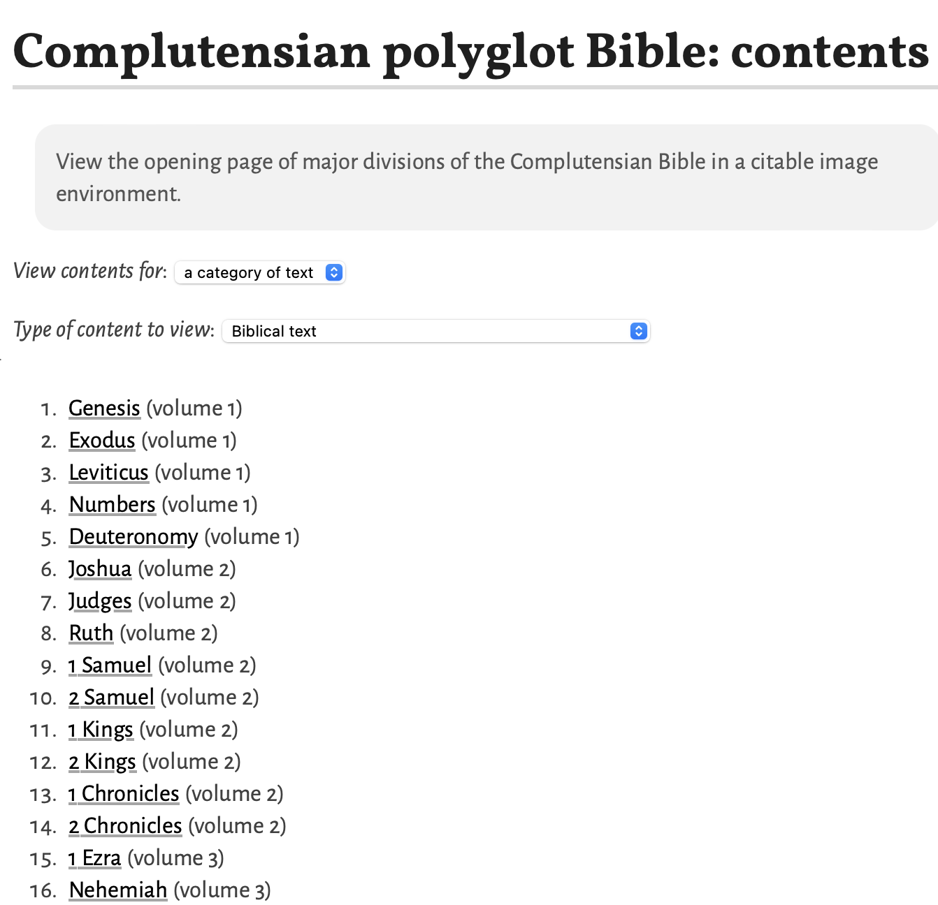 Select category of contents (texts, reference materials, other). Sections are listed with links to image of first page in a zoomable/pannable display.