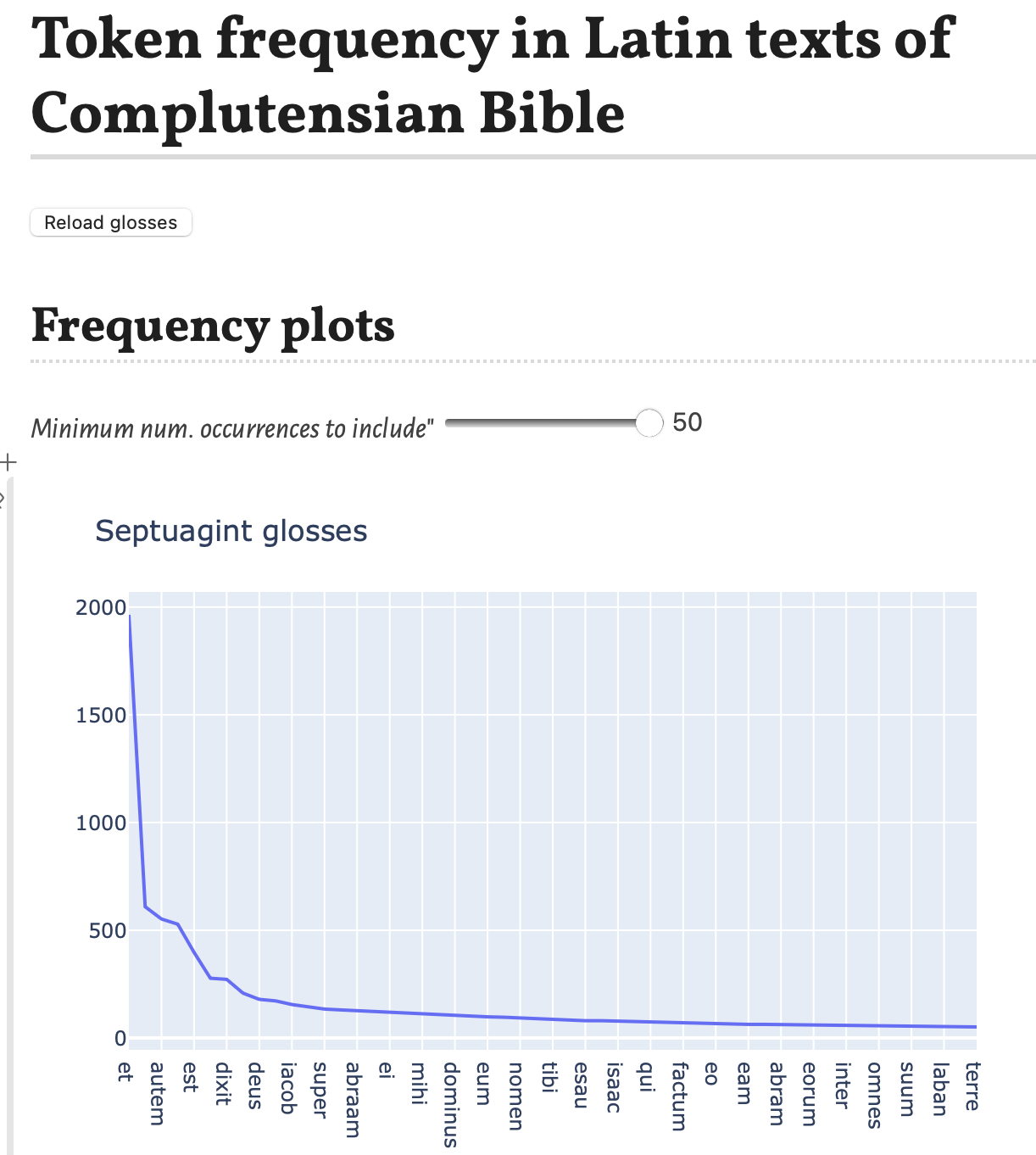 Choose a minimum number of occurrences to consider, and graph frequencies of tokens for each of the texts in the Complutensian Bible.